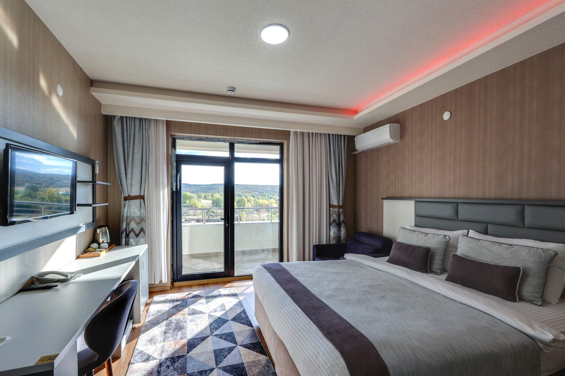 Yatak odasında konukları 2 kişilik bir yatak karşılar, yanında gardırop ve şifonyer gibi depolama alanları da vardır. Odada ayrıca rahat bir izleme deneyimi sunmak için bir led TV yer almaktadır. Bu özellikler, konukların konaklama süresince rahat ve rahatlamış bir tatil geçirmelerine olanak tanır.